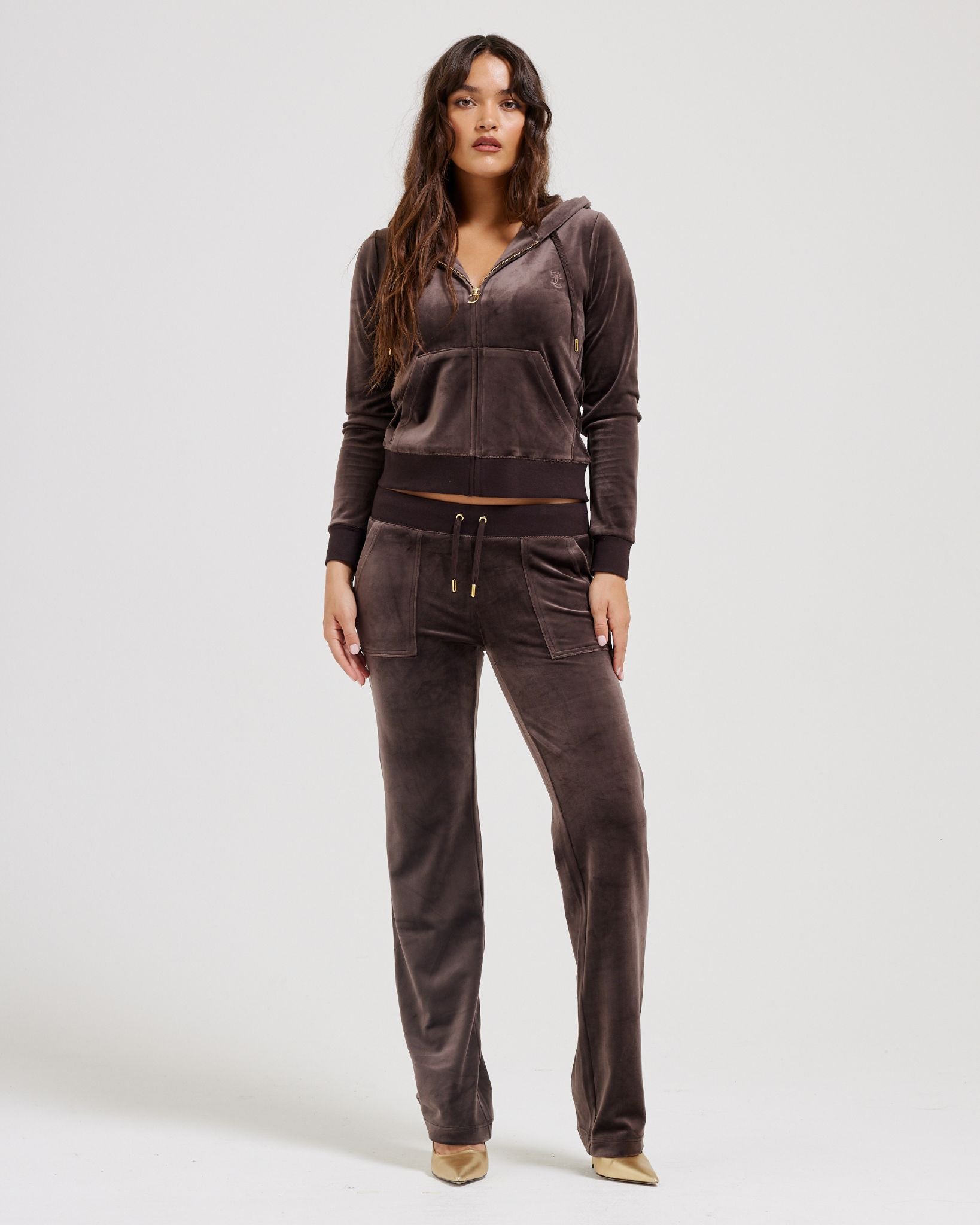 Juicy Couture High-rise plain tracksuit bottoms in classic velour. Flared leg fit, with adjustable drawstring ribbed waist and front feature patch pockets. These core joggers feature back popper fastening pockets, gold branded hardware and are finished with a tonal embroidered Juicy Couture JC-logo at the hip.